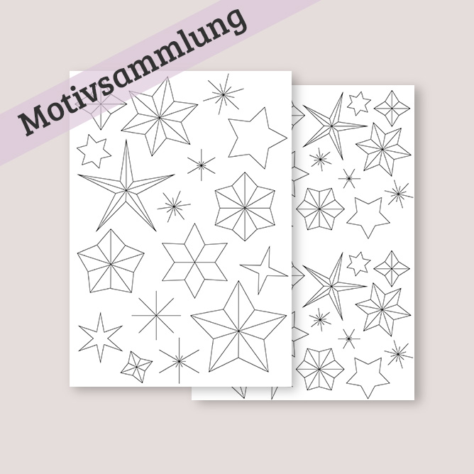 In der Motivsammlung Sterne sind 17 Motive enthalten. Du kannst diese Motive nach deinen Vorstellungen sticken und dich kreativ austoben. Die Motivsammlungen enthalten keine Anleitung, wie die Motive gestickt werden.